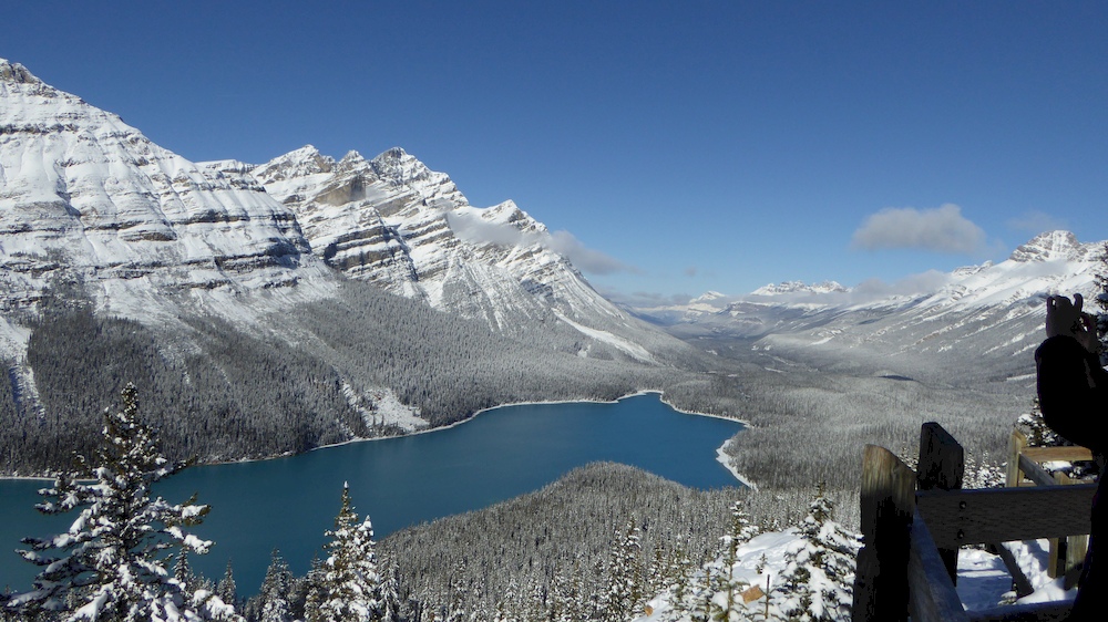 Les chutes d'Athabasca sont très spectaculaires. Des canyons où s'engouffrent des tourbillons puissants d'eau bleue. Le lac Peyto était un peu plus que sympa. L'un et l'autre ont donné lieu à des balades féériques, parfois raides : il n'y avait pas que la vue pour couper le souffle, la grimpette aussi. Mais avec la neige verglacée et piétinée, on avait au moins l'excuse de la précaution anti-glisse pour le faire lentement, hmm mais pas toujours dignement ...